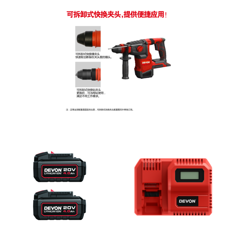 5402-Li-20RH26Q/N :可換夾頭機款(連機上一個電錘夾頭和一個可拆式鑽夾頭)